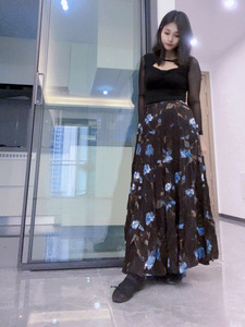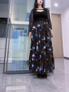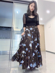 复古山茶花半身裙女2025秋季新款褶皱百褶裙中长款A字裙休闲长裙