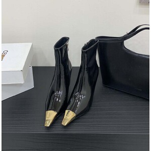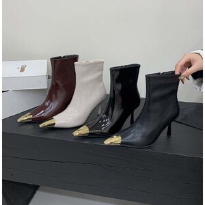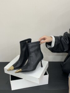 短靴女一件代发现货2025欧美新款黑金色细跟靴子金属头高跟时装靴