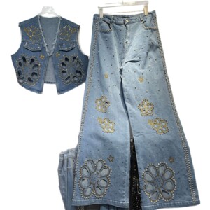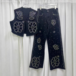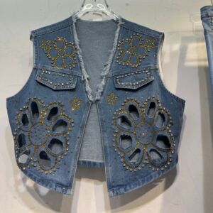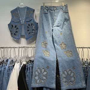 2025秋季新款大码牛仔毛边设计马甲重工镶钻镂空花朵高级感牛仔裤