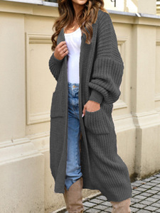 跨境针织新款欧美长袖长款纯色开襟口袋开衫亚马逊宽松大码毛衣女