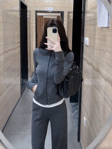 修身条纹外套女款秋2025新款早秋灰色上衣韩系运动套装老钱风穿搭