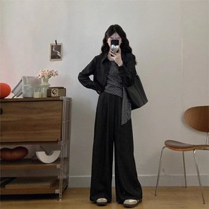 2025秋季新款气质格子收腰绑带吊带+牛仔外套+牛仔阔腿裤三件套女