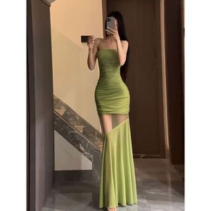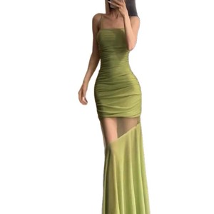 纯欲气质绿色网纱拼接吊带连衣裙女夏季新款收腰显瘦包臀尾长裙子