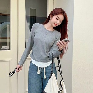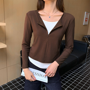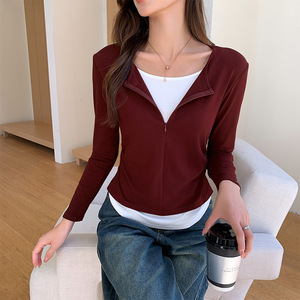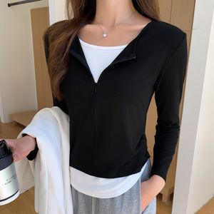 假两件半拉链甜酷设计感早秋装春秋季撞色辣妹修身捏褶长袖女上衣