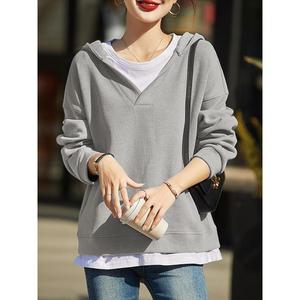 春秋装300斤特大码宽松连帽假两件遮肉拼接中长款休闲长袖卫衣女