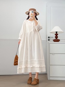 日系木耳领斜襟棉质连衣裙秋季新款宽松百搭收腰系带减龄刺绣裙子