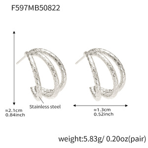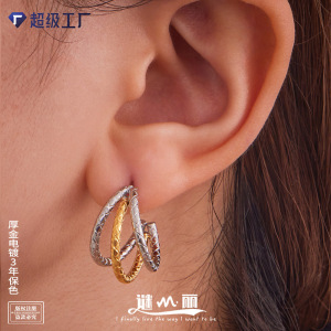 谜丽新款不锈钢间电三层耳环PVD镀金菱形纹理C形耳饰欧美跨境饰品