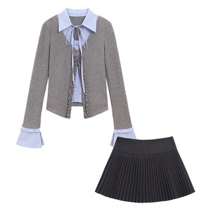 早秋新款法式复古气质小个子减龄假两件长袖拼接衬衫百褶裙两件套