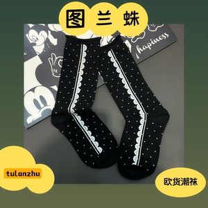 时髦袜子女欧货个性潮袜秋冬新款黑色波点仿蕾丝ins简约中筒袜
