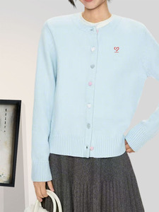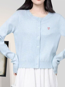 春秋新款浅蓝爱心刺绣针织开衫女圆领甜美毛衣清新简约外套上衣