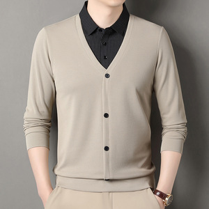 跨境批发男士假两件polo衫长袖T恤春秋新款条纹衬衫翻领休闲上衣