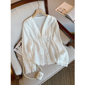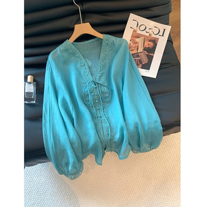 蓝色法式v领蕾丝亚麻防晒衬衫女夏2025新款高级宽松洋气长袖上衣