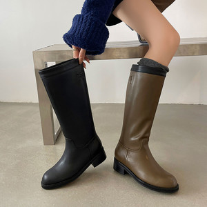 牛皮骑士靴女高筒长靴子秋冬新款真皮圆头套筒宽松及膝靴女单靴子