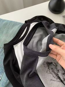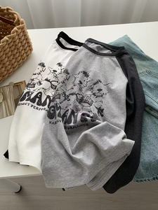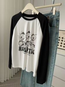 好看又减龄!插肩袖撞色减龄印花长袖T恤女秋季新款复古显瘦上衣