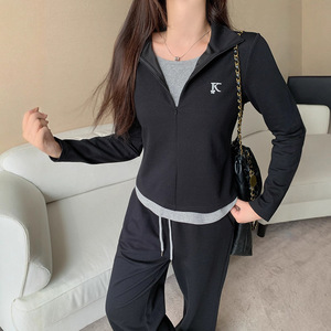 2025秋季新款胖mm大码女假两件半开领刺绣卫衣上衣阔腿裤套装