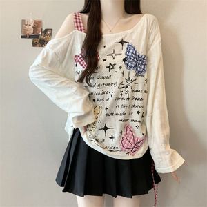 大码美式蝴蝶贴布印花露肩长袖t恤女秋季新款宽松显瘦抽褶上衣女