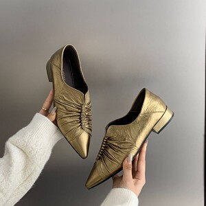 欧洲站女鞋25秋冬时尚软褶皱金属牛皮尖头舒适一脚蹬踩跟平底单鞋