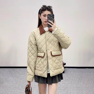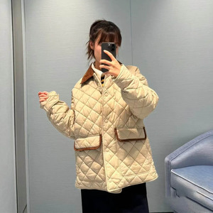 秋冬新款字母刺绣老钱风撞色翻领菱格棉服百搭显瘦夹克上衣外套女