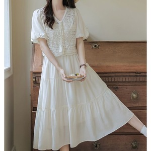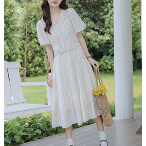 法式套装连衣裙夏季两件套镂空系带蕾丝印染裙套装超短裙长袖无袖