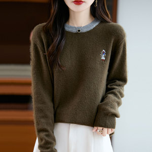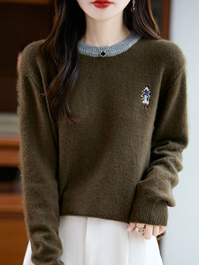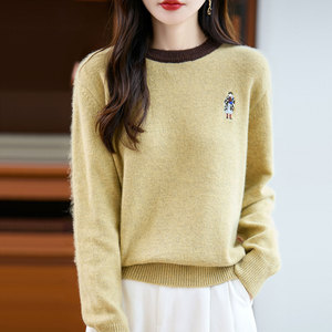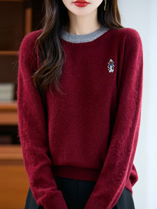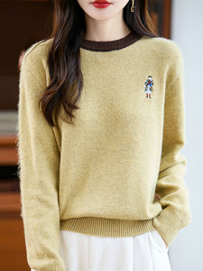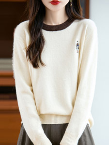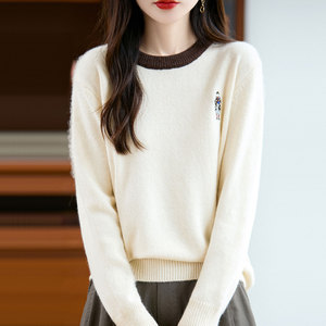 【厂家直供】秋季新款撞色圆领针织短款长袖女士毛衣刺绣打底衫潮