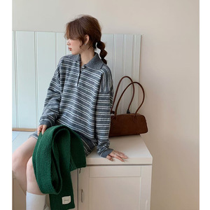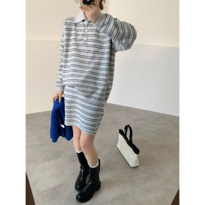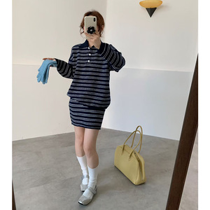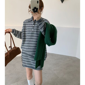 韩系简约宽松慵懒风条纹套头毛衣女套装秋冬新款针织半身裙两件套
