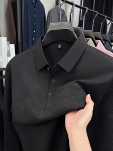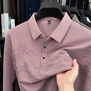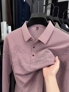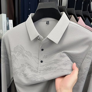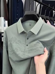 跨境翻领长袖男t恤国风印花宽松百搭薄款上衣男时尚潮流Polo衫男