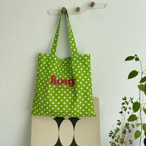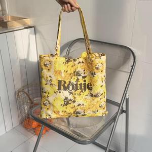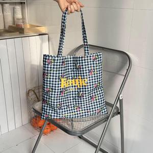 2025新款ins博主Rouje同款时尚帆布袋包包蓝格纹花朵印花单肩包潮