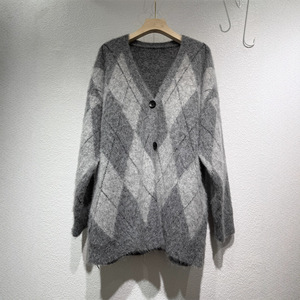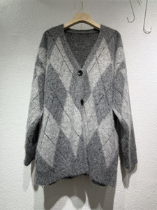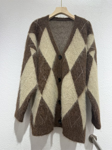 格纹针织开衫外套女秋冬季新款韩版宽松慵懒风毛衣女复古V领上衣
