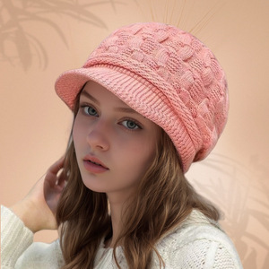 跨境新款羊绒鸭舌帽子冬季加绒加厚保暖毛线帽女士护耳防寒针织帽