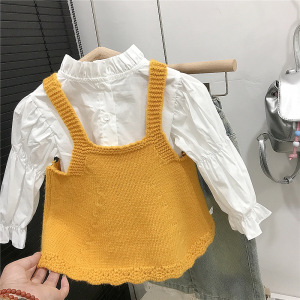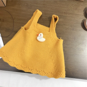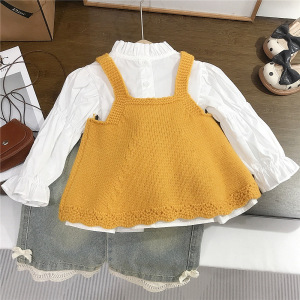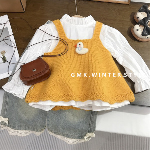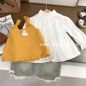 秋季女童韩版甜美可爱小鸭子针织背心宝宝娃娃领打底衫牛仔裤外贸
