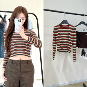 2025早秋复古棕色条纹刺绣标长袖圆领短款毛衣修身显瘦全面上衣女