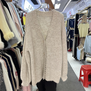 温柔慵懒风重工钉珠春秋V领中长针织开衫减龄显示百搭女毛衣外套