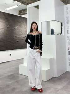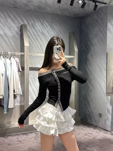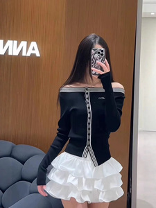 Ann南油早秋新款修身条纹设计感一字肩不对称上衣