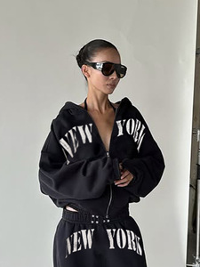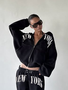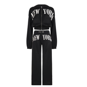 新款美式字母印花街头个性潮流风连帽纯色套装拉链卫衣+休闲卫裤