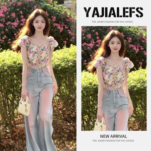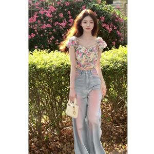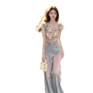 2025夏季新款时尚甜美减龄短袖印花衬衫上衣高腰宽松直简洋气裤子