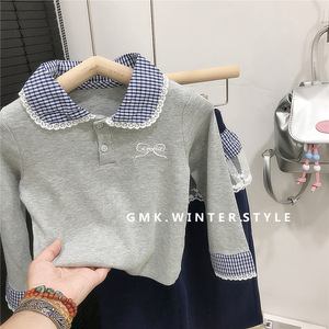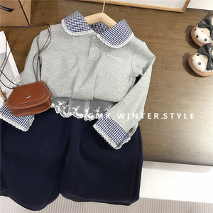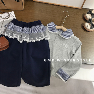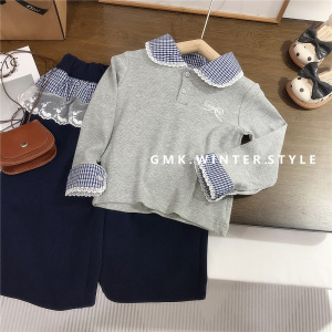 女童秋季新款灰色格子蝴蝶结套装女宝宝洋气翻领卫衣阔腿裤棉外贸