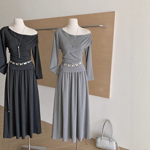 2025新款法式极简慵懒斜肩长袖针织上衣显瘦半身裙蝴蝶腰带三件套