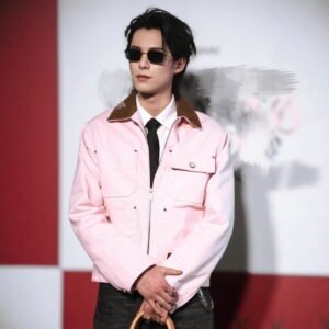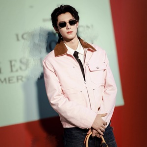25秋冬新款王鹤棣同款下摆撞色皮牌装饰翻领拉链休闲夹克外套
