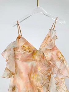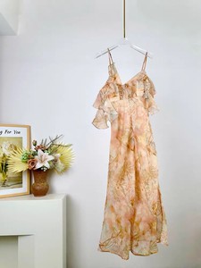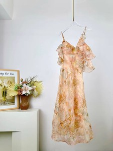 温柔风氛围感荷叶边印花高腰吊带裙女2025新款优雅知性花边批发女