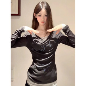 韩系复古假两件印花荡领长袖t恤女早秋收腰设计感气质别致上衣潮