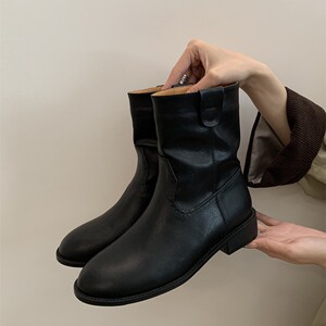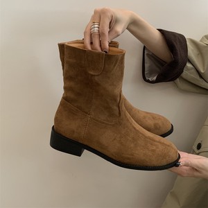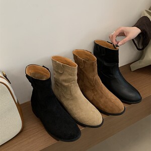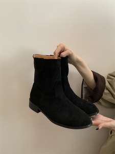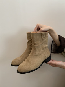 粗跟韩版短靴百搭西部靴秋冬复古绒面卡其色短筒靴马丁靴法式女靴