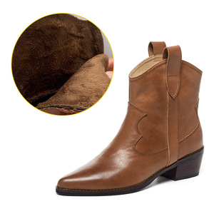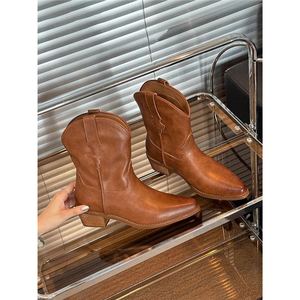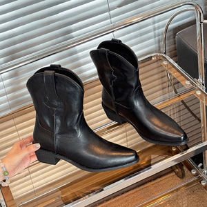 复古英伦风短靴女2025春秋新款时尚尖头单靴小个子粗跟西部靴