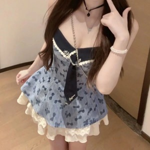 纯欲风甜美短裙夏季收腰显瘦设计感撞色蕾丝拼接印花吊带裙抖音潮