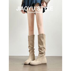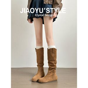 牛皮版~骄屿勃肯长筒靴女不过膝2025春秋新款高筒复古褶皱堆堆靴