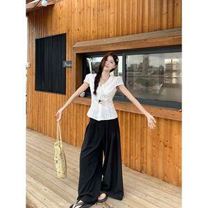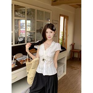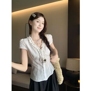 法式复古V领荷叶边短袖衬衣女夏季白色别致收腰衬衫温柔风上衣
