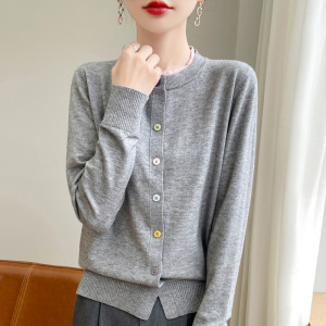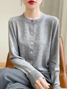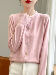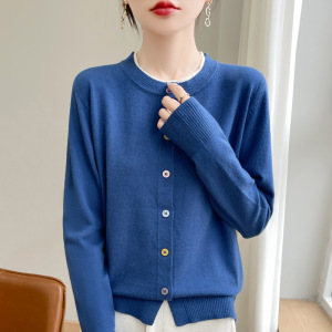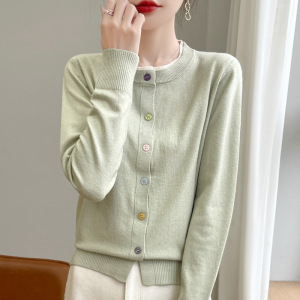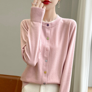 25早秋新款安迪绒圆领针织开衫长袖女彩扣拼色宽松百搭假两件上衣