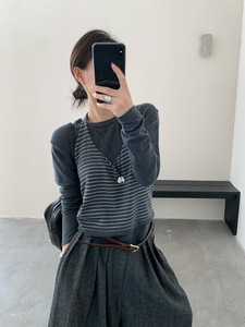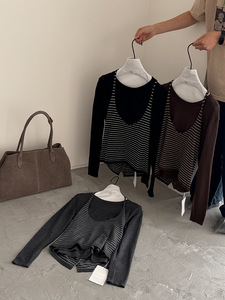 THINK十三行韩系条纹针织套装女2025秋小众撞色背心长袖打底套装