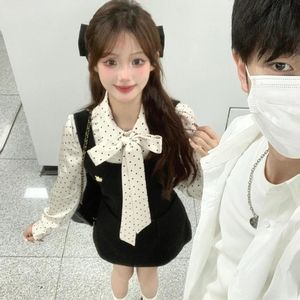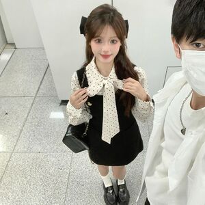 早秋穿搭一整套韩系复古小个子背心连衣裙子波点蝴蝶结衬衫女学生