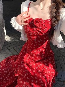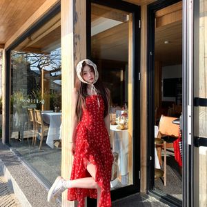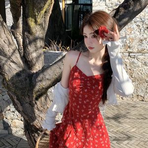 2025春夏新款绝美定义红色度假吊带开叉碎花开衫长裙两件套套装女