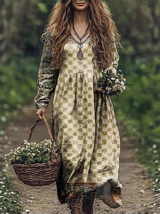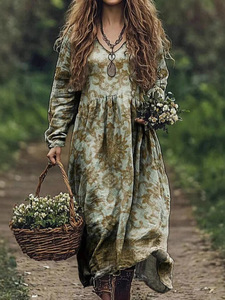 2025秋季新款跨境复古印花连衣裙独立站亚马逊V领长袖连衣裙大码